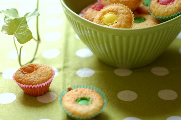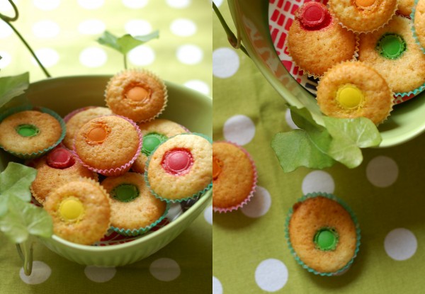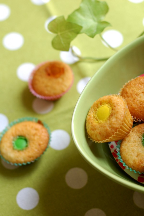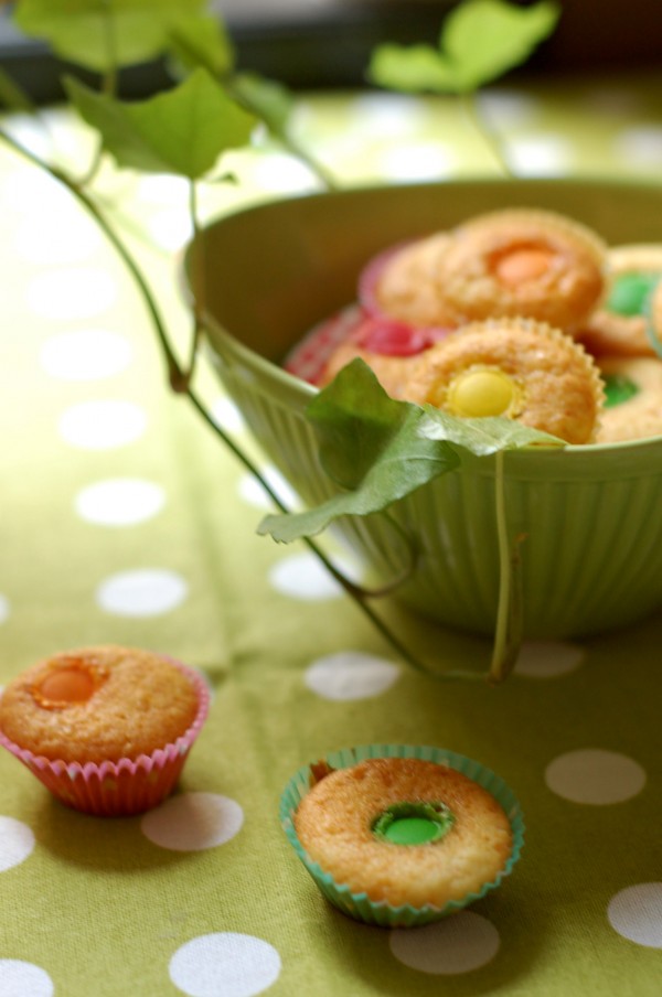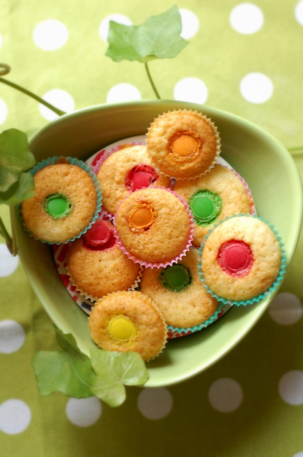Muffins måste ju inte vara amerikanskt stora och överdådiga varje gång man bakar dem. Ibland kan de få vara små och enkla också. Sådana här färggranna små saker är fantastiskt piffiga att bjuda på när fikabordet är fullt av kakor och man vill kunna orka många sorter. Jag gör dem i pastelliga små knäckformar, modell något större än de vanliga, för att få dem att se extra glada ut.
