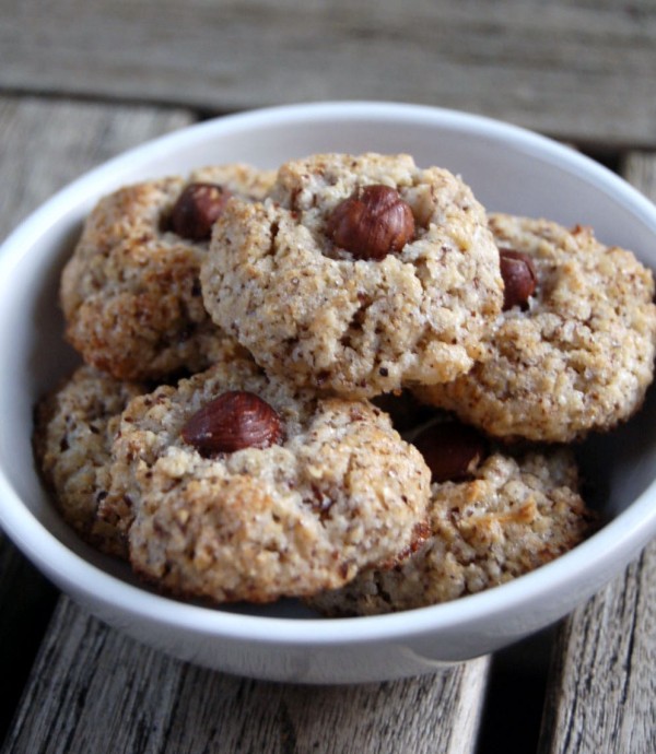 Mal nötterna i en mandelkvarn. Vispa upp ägget lätt och blanda med övriga ingredienser och de malda nötterna. Klicka ut på smeten på en bakplåt med bakplåtspapper och tryck ner en hel hasselnöt i mitten av varje kaka. Grädda i 200 grader i ungefär 8 minuter.