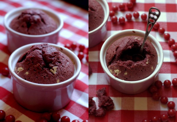 Blanda smör och socker och rör sedan i äggen, ett åt gången. Rör ner mjölet, blandat med bakpulvret och sedan mjölken. Färga smeten rejält röd med karamellfärg. Klicka ut i muffinsformar. Fyll dem ungefär till hälften. Gör små fördjupningar i varje muffin och tryck ner rikligt med lingon och chokladbitar. Grädda i 175 grader i cirka 20 minuter.