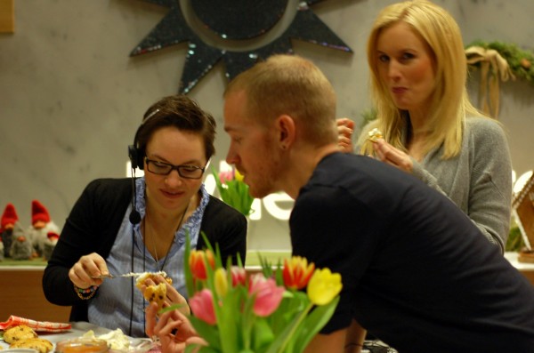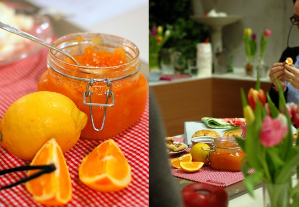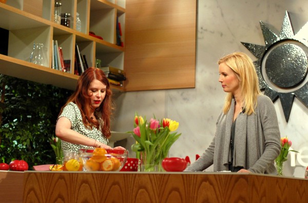 Jag hade en vansinnigt rolig dag på TV4 igår. Eftersom det var helg började Nyhetsmorgon lite senare än vanligt och jag fick sova ut till klockan 05.00 (förstår ni hur befängt tidigt de här människorna går upp till vardags?). Därefter släpade jag mig själv och åtskilliga kilo citrusfrukter till Gärdet och påbörjade en lång förmiddag av marmeladkok, sconesbakning och kaktillverkande i väldigt trevligt sällskap.