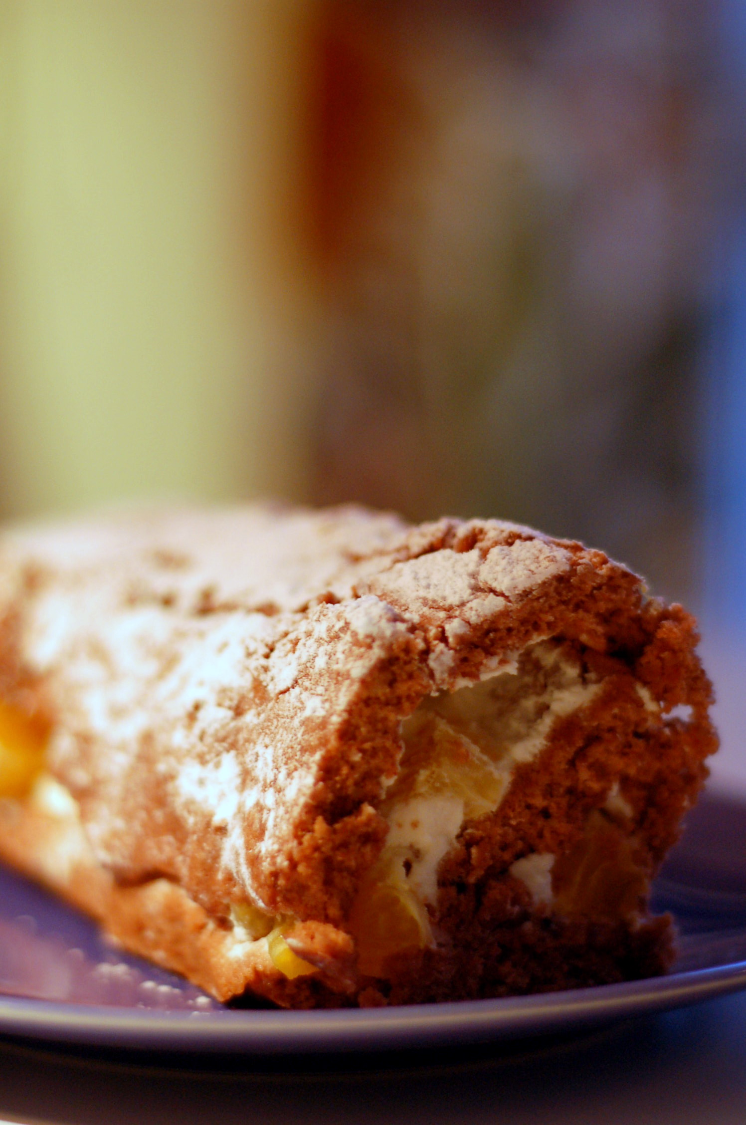 Hacka hasselnötterna fint och blanda dem med mjölet och kakaon. Vispa upp äggvitorna till ett hårt, vitt skum och vispa därefter ner sockret. Vänd ner nötblandningen försiktigt i marängsmeten och bred sedan ut den i en långpanna klädd med bakplåtspapper. Grädda i 175 grader i 10-15 minuter och dra sedan försiktigt bort bakplåtspappret från undersidan av kakan. Bred över vispad grädde och grovt skurna clementinklyftor. Rulla ihop, sikta eventuellt över lite florsocker och skär i bitar.