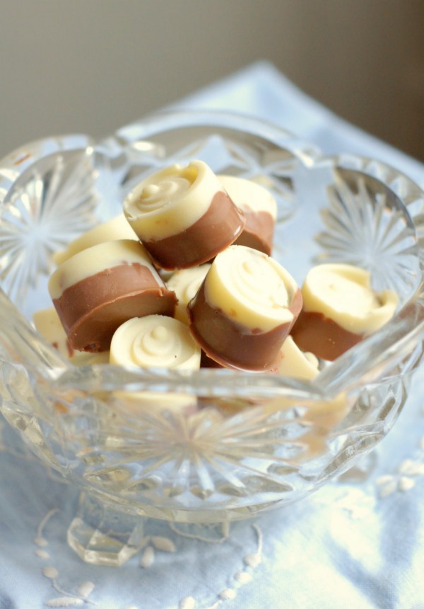 Bryt chokladen i småbitar och smält den försiktigt var för sig i några matskedar upphettad rapsolja (rör under tiden). Rör tills chokladen är slät. Fyll pralinformar (jag använder sådana här i silikon) till hälften med den vita chokladen. Hacka daimen fint och strö över. Fyll upp resten av formarna med mjölkchokladen. Ställ att stelna i kylen och ploppa sedan ut chokladen ur formarna. Har man inga pralinformar går det fint att använda ischokladformar istället.