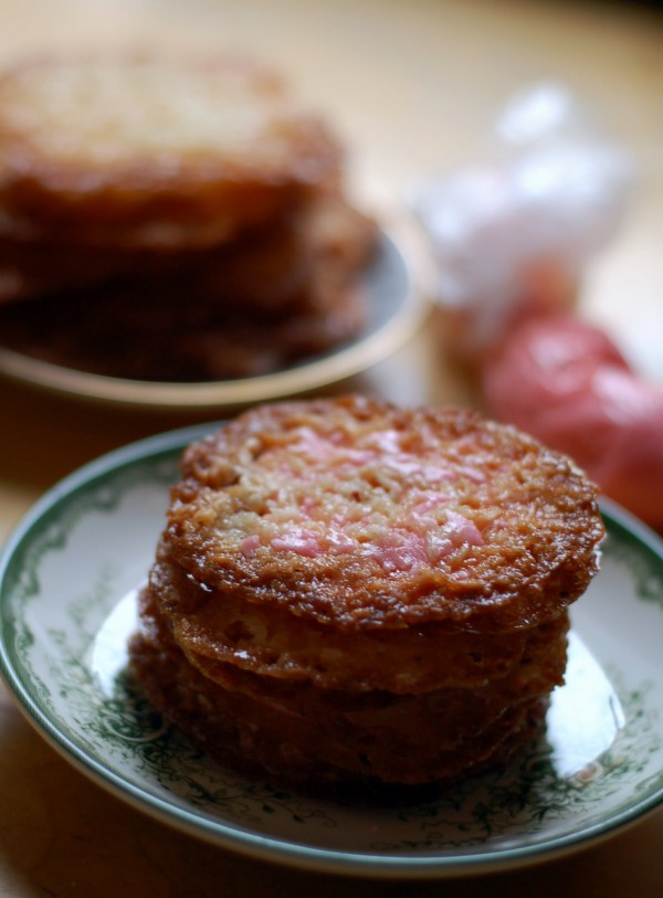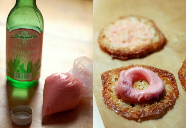 Finns det något mer drömskt och skört än fina kokosflarn? Den här gången har jag bakat dem ganska små, lagt ihop dem två och två och brett ljusrosa smörkräm med smak av rosor emellan.