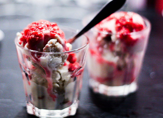 Veckans godaste bild kommer från Klara som gör bloggen Klara och den snälla gamla tigern. Hon har gjort den här goda saltlakritsglassen och serverat den med härligt röda hallon. Hur fint som helst!