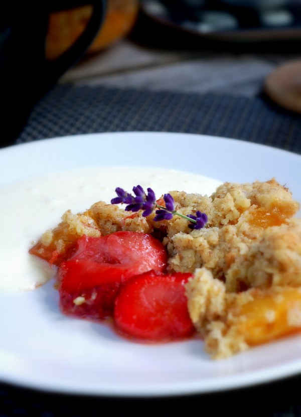 Den här väldigt enkelt ihopslängda smulpajen gillar jag att göra till lite sötare frukter och bär, som till exempel jordgubbar och nektariner. Om årstiden inte tillåter färsk frukt, går det bra att baka den med konserverade persikor (väl avsköljda) och frysta jordgubbar istället.