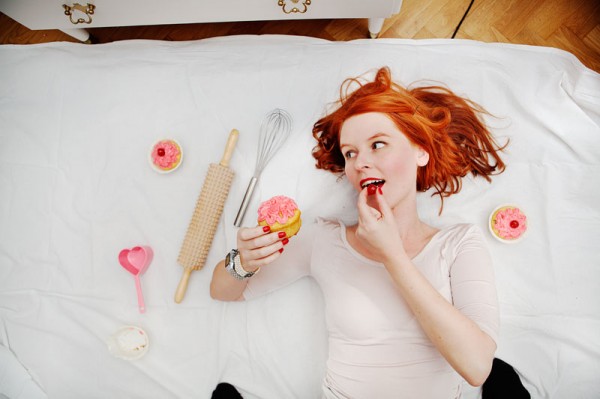 Man kan lätt tro att det är en väldigt glamourös och exklusiv tillställning att bli fotad sådär piffigt, men så är det inte alls. På hårt golv och provisoriskt, omanglat lakan får man ligga medan en fnissig fotograf trampar runt och ibland på en, samtidigt som han sjunger sig igenom fler Meatloaflåtar än någon människa ska behöva höra sammanlagt under ett helt liv. En stor fördel är dock att man kan passa på att äta en rekvisitacupcake medan han då och då fixar med ljuset.