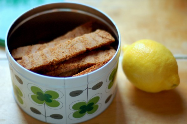 Rör samman det rumsvarma smöret med sockret till en jämn smet. Blanda ner sirap och det rivna citronskalet. Blanda mjöl och bikarbonat för sig och rör ner. Forma till två längder och platta ut på en plåt med bakplåtspapper. Grädda i 175 grader i cirka 15 minuter och skär sedan i sneda skivor. Låt svalna på plåten och förvara sedan i burk med lock.