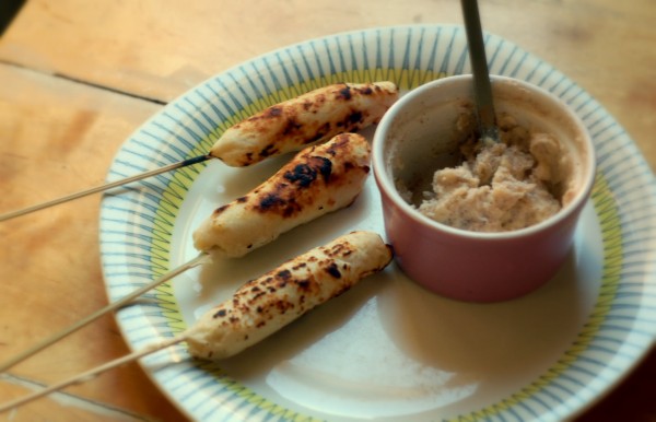 Arbeta samman allt till en kladdig deg. Trä på spett eller pinne och grilla över öppen eld tills den får färg. Doppa i kanelsmör och ät.