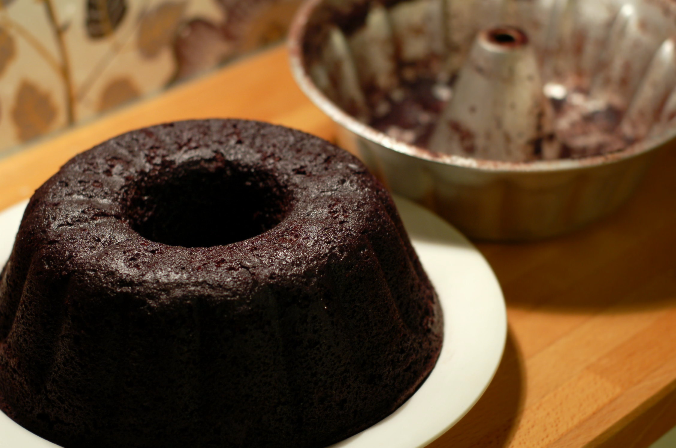Smält smöret och bryt ner chokladen i det. Rör tills den smälter ihop med smöret. Vispa socker och ägg och rör sedan ner chokladblandningen och de övriga ingredienserna. Häll i smord och kakaopudrad sockerkaksform (med hål i) och grädda i 175° i cirka 40 minuter. Låt kakan svalna helt innan du tar ur den ur formen.