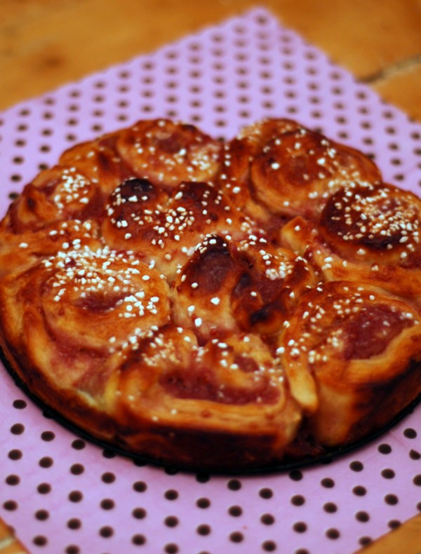 Smält smöret. Tillsätt mjölken och rör ut jästen. Häll i socker, salt och kardemumma. Baka i vetemjölet (spara lite till utbakningen). Knåda degen ordentligt och låt jäsa under duk i 30 minuter. Arbeta sedan degen igen på bakbordet (använd det sparade mjölet). Dela i fyra delar och kavla ut till tunna längder. Bred ut halloncurden på den utkavlade degen. Rulla ihop och skär till bullar. Låt de flesta bullarna jäsa i 30 minuter under duk, men lägg sju stycken i en rund form och jäs dem där. Pensla med ägg och grädda i 250 grader i 8-10 minuter.