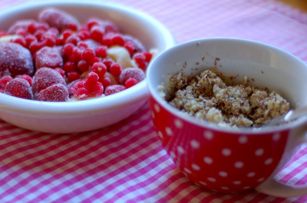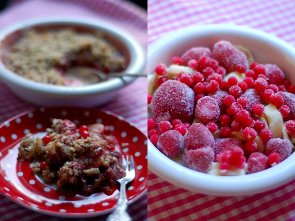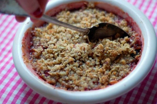 Det är svårt att tro när man äter den, men den här smulpajen är i själva verket en ganska nyttig historia. Jag bakar den i en mindre porslinsform och använder hemgjord müsli och de frukter och bär jag har tillgängliga i fruktskål eller frys. Senast blev det jordgubbar, röda vinbär och banan.