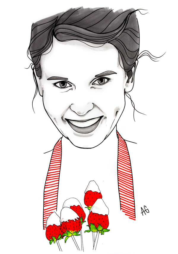 Den här sjukt snygga bilden gjorde tecknaren Anna Grundberg häromdagen. Att bli avritad av någon som är såhär duktig är en fantastiskt rolig och surrealistisk sak och får mig alltid att känna mig lite som en filmstjärna (fast i förkläde istället för rödamattanklänning då). Jordgubbsklubborna i förgrunden är mina absoluta sommarfavoriter och återfinns här.