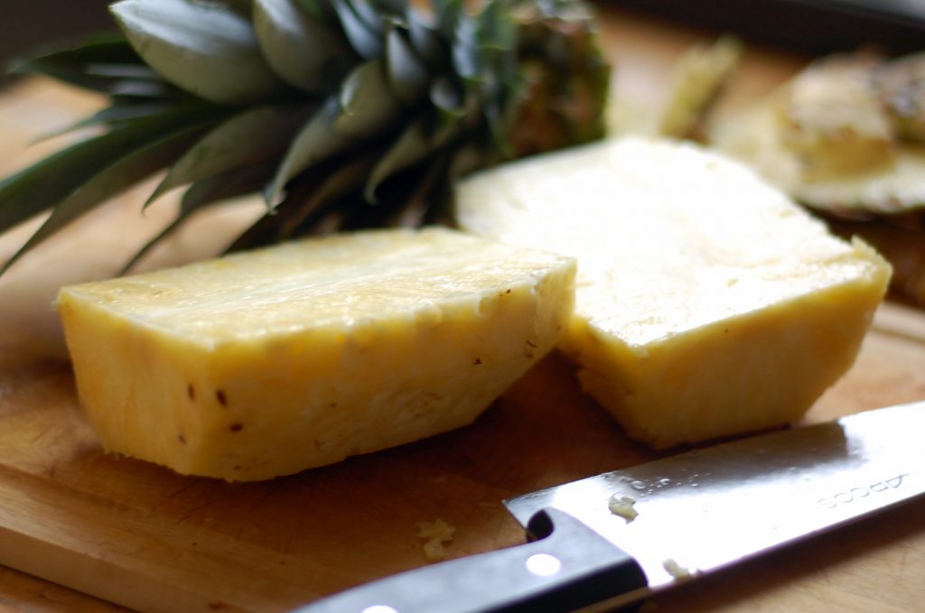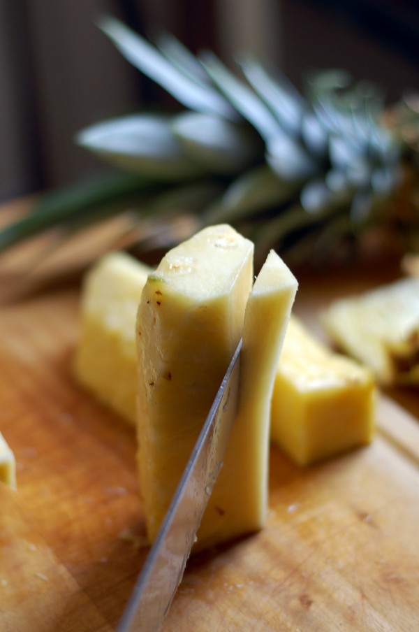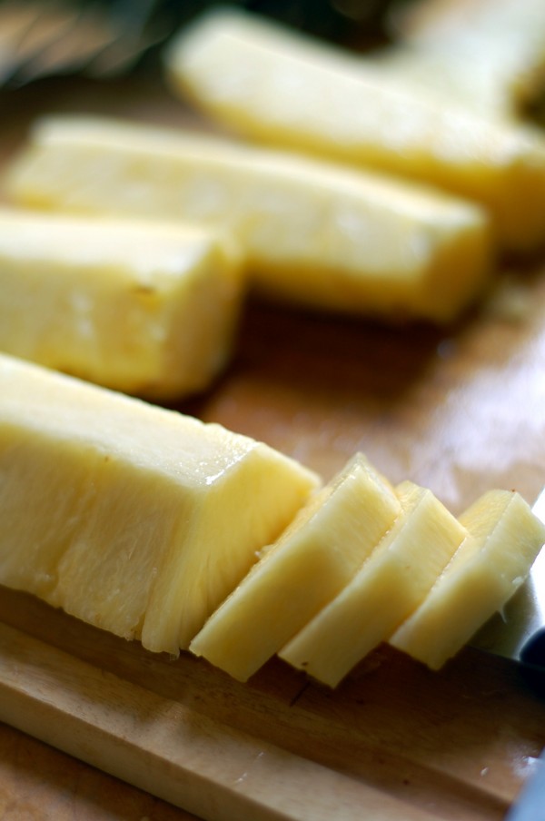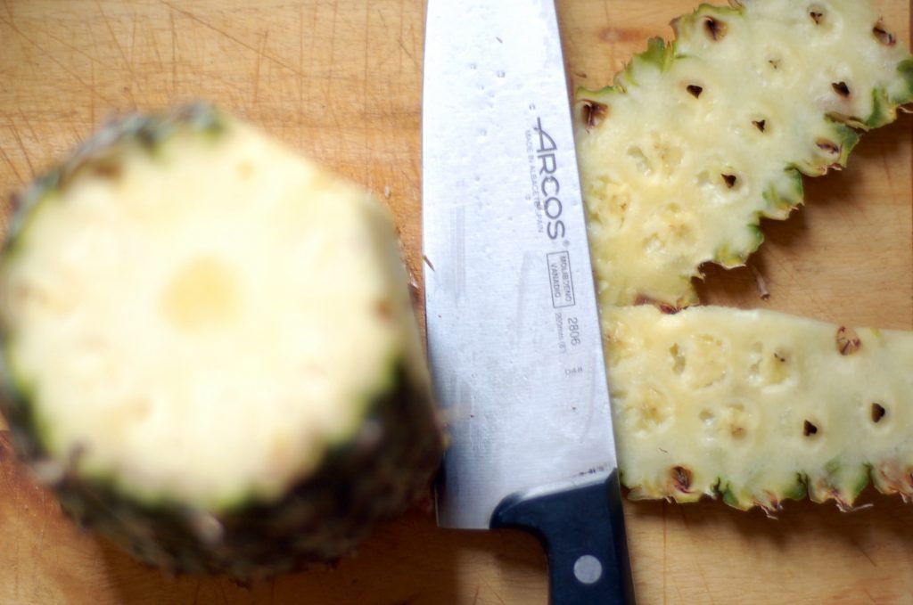 Färsk ananas måste väl ändå vara den 80-taligaste frukten ever? Man vill liksom bara glasera den eller fritera den eller göra någon typ av vulgär glasskål av den så fort man ser den, tycker jag. Mitt bästa tips är trots det att skära den i lagom stora skivor och äta dem som de är eller baka världens bästa paj med dem. Det som blir över kan man frysa in och göra isiga smoothies eller goda milkshakes av. Det här är enligt mig det lättaste sättet att skära ananas: