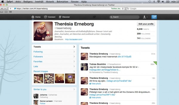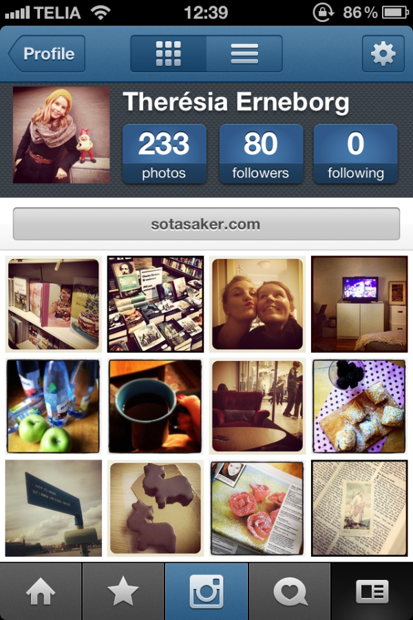 Om man gillar bilder och har tillgång till en nymodig telefon kan man ha koll på vad som händer i min och bloggens vardag via fotoappen Instagram. Den är för övrigt ett förträffligt roligt sätt att dokumentera sin omgivning och följa sina vänner – och dessutom alldeles gratis att ladda hem. Mitt konto hittar man genom att söka efter teaerneborg.