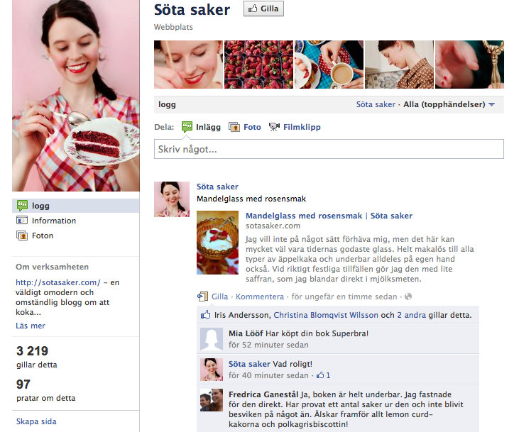 Ni vet väl att man kan följa (eller “gilla”) Söta saker på facebook också? Då får man nya blogguppdateringar direkt i sitt facebookflöde, en hel massa “bakom-kulisserna-bilder” och så kan man lätt kommentera och dela med sig av recept man tycker om till sina vänner. Har ni förslag eller önskemål om fler saker som ni skulle vilja ha på facebooksidan? Skriv en kommentar och tipsa vettja!