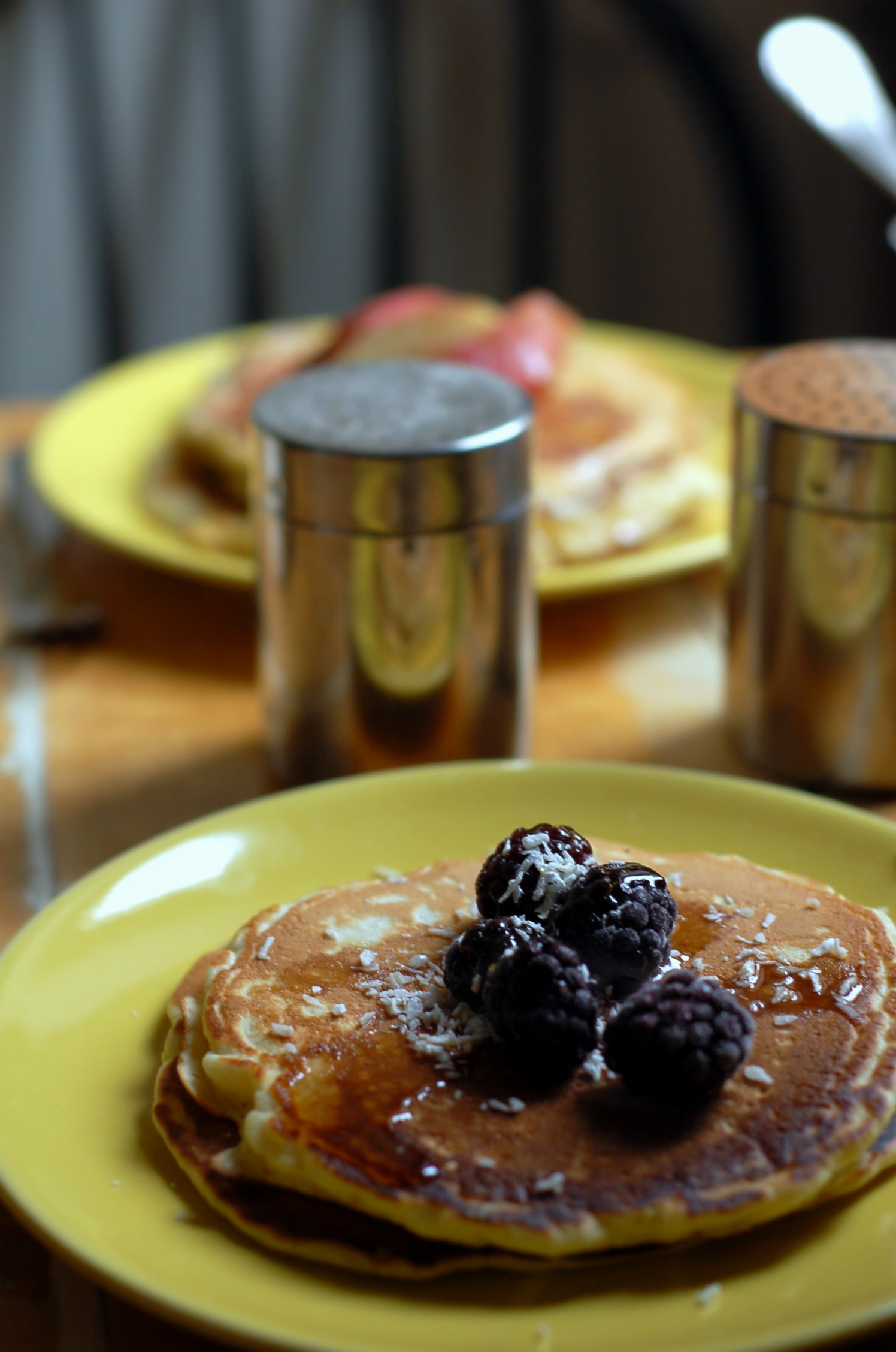 Amerikanska pannkakor lyfter lite mer än de svenska och blir både tjockare och sötare. Man gör dem med precis vilken smaksättning man önskar – blåbär, pecan, äpple, bacon – eller som här med kokos, lönnsirap och den godaste glassen sedan grädden kom.
