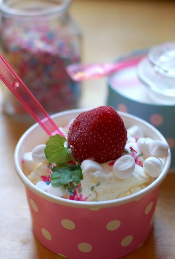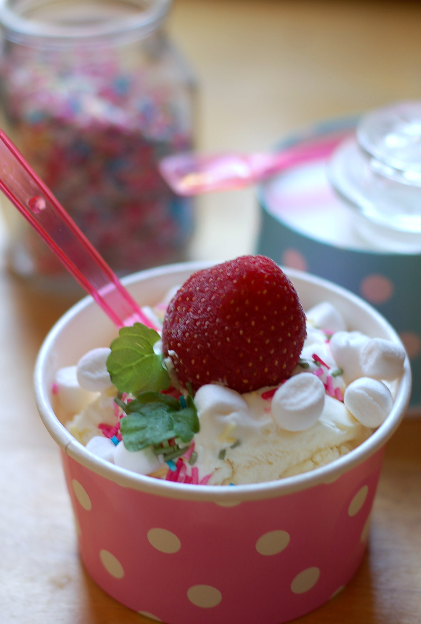 Skär jordgubbarna i tunna skivor och varva dem med vaniljglass i ett glas eller kopp. Klicka över rejält med vispad grädde och ös på med strössel och marshmallows.