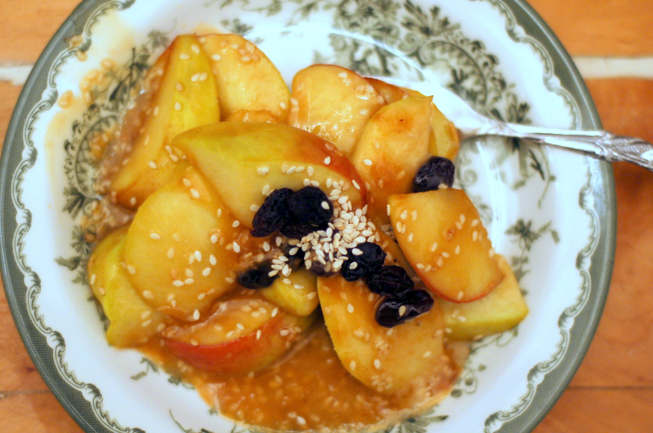 Skiva ner äpplena lite slarvigt i en het stekpanna med lite smör. Låt dem fräsa tillsammans med russin och strö över lite sesamfrön. Slå över grädde och lönnsirap och låt blandningen sjuda ihop ordentligt. Toppa med lite kanel och servera med vaniljglass.
