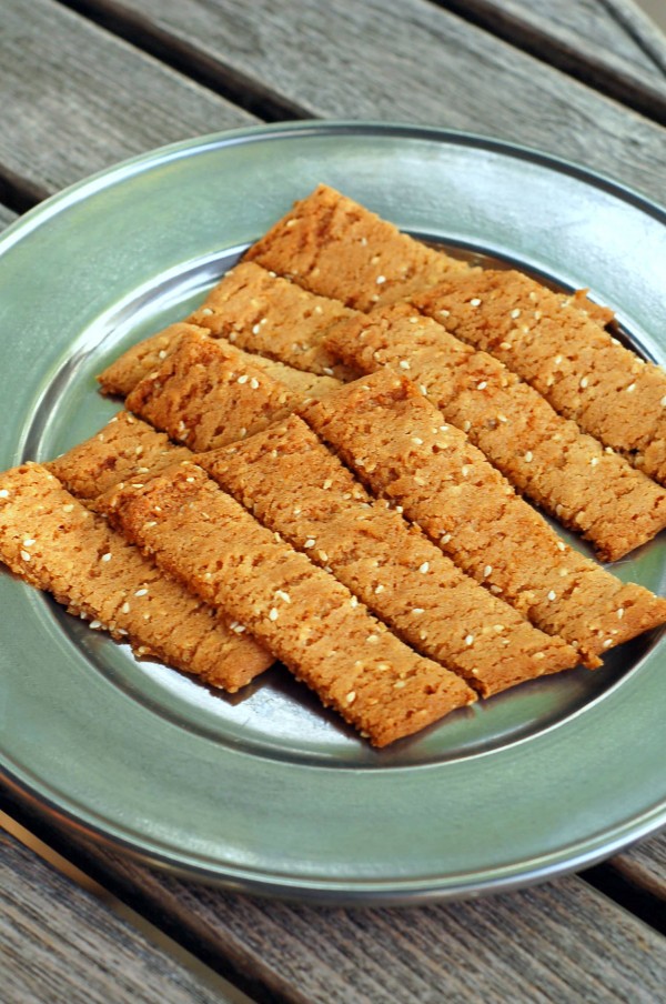 Rör samman det rumsvarma smöret med sockret till en jämn smet. Blanda ner sirap och sesamfrön. Blanda mjöl och bikarbonat för sig och rör ner. Forma till två längder och platta ut på en plåt med bakplåtspapper. Grädda i 175 grader i cirka 15 minuter och skär sedan i sneda skivor. Låt svalna på plåten och förvara sedan i burk med lock.