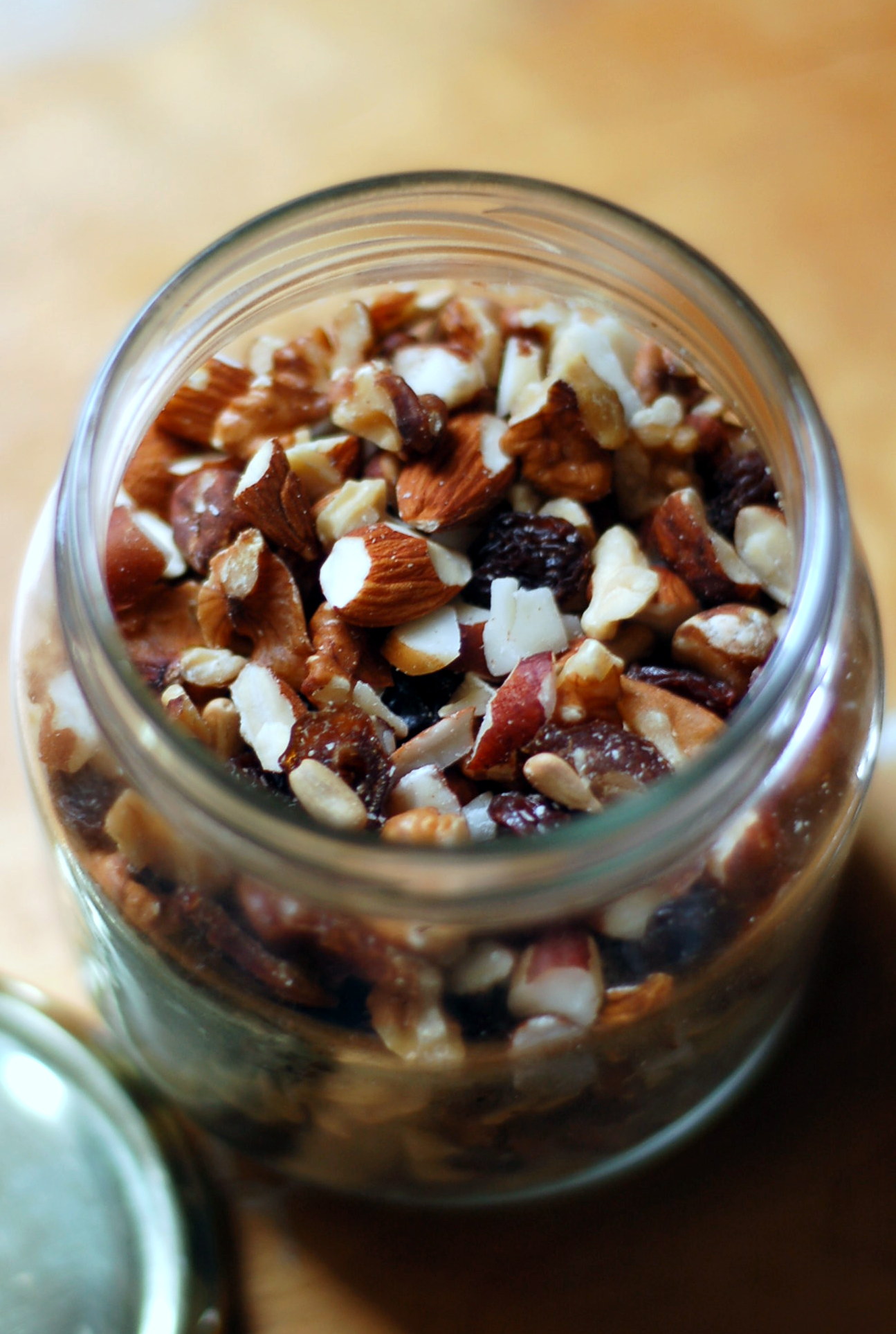 Ett smart sätt att återanvända alla goda julnötter och glöggrussin som blivit över är att grovhacka dem och kombinera dem till goda nötblandningar. Jag brukar nästan alltid ha en burk blandade nötter i lagom hackstorlek på skafferihyllan. Jag använder dem till att göra snabb müsli, strö över sallad, eller helt enkelt till att baka kakor med. Det är hemskt smidigt att slippa ta fram skärbrädan varje gång det står “hackade nötter” i ett recept. Den här gången har jag blandat valnötter, paranötter, sötmandel, hasselnötter och saftiga russin. Men det där gör man precis som man själv vill!