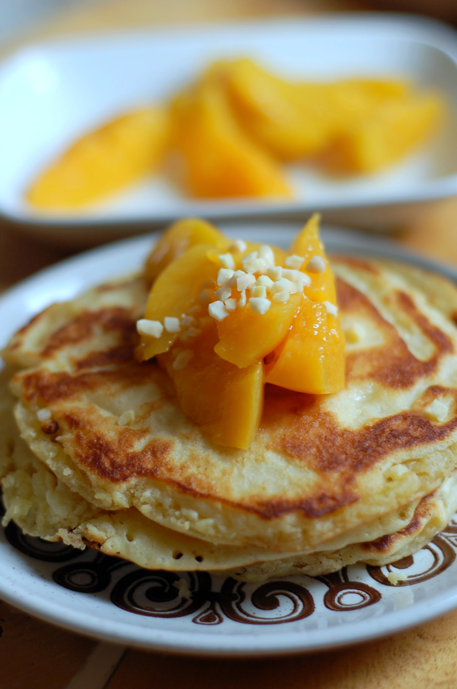 Blanda mjöl, bakpulver, salt och socker och rör sedan i de övriga ingredienserna. Grädda i en liten stekpanna och garnera med skurna persikor, hackad mandel, pudrat florsocker och lönnsirap.