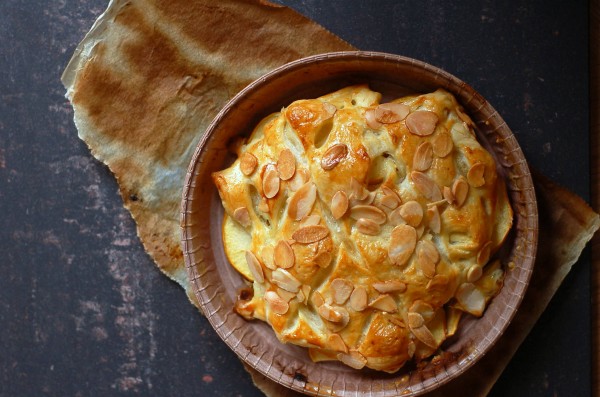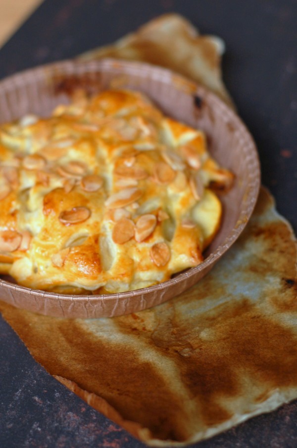 Kavla ut smördegen till önskad tjocklek. Skär äpplena i skivor (använd såklart alltid ekologiska äpplen när du bakar – och annars också för den delen!). Pudra över kanel och lägg dem i en smord pajform. Täck med smördeg, pensla med lite uppvispat ägg och strö över mandelspån. Grädda i 225°C i cirka 10 minuter.