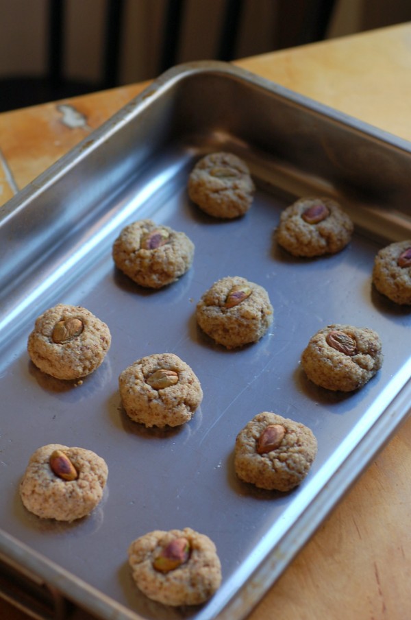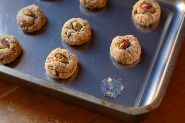 Mal nötterna i en mandelkvarn. Vispa upp ägget lätt och blanda med övriga ingredienser och de malda nötterna. Rulla till små bollar och ställ på en bakplåt med bakplåtspapper. Tryck ner en hel pistaschkärna i mitten av varje kaka. Grädda i 200 grader i ungefär 8 minuter.