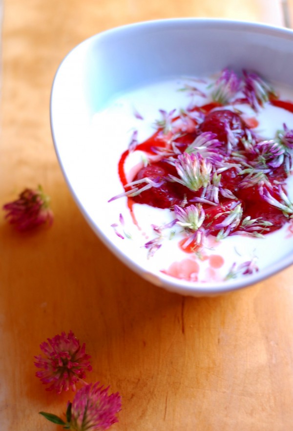 Söta i smaken och riktigt vackra blir de i frukostfilen. Rödklövern växer bokstavligt talat som ogräs överallt just nu och är en av mina favoriter att koka te på eller dekorera morgonyoghurten med.