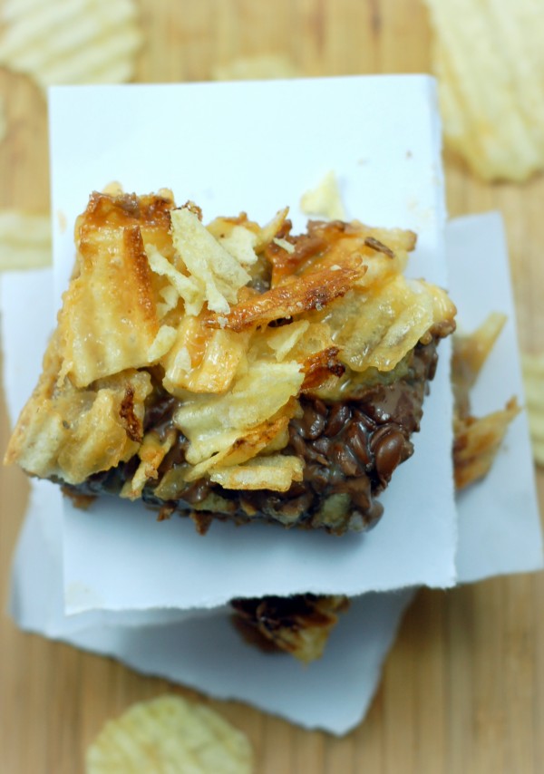 Krossa de salta pinnarna och blanda dem med smöret och jordnötssmöret i en mixer tills de blir en kladdig deg. Tryck ut degen i botten av en smord ugnsfast form (ca 15 x 20 cm). Hacka de salta jordnötterna och chokladen (eller använd chocolate chips) och strö över i ett jämnt lager. Lägg chipsen i ett lager över chokladen och täck dem med den kokta kondenserade mjölken. Strö över lite flingsalt och baka i 175 grader i 20 minuter. Låt svalna och skär i rutor.