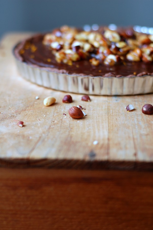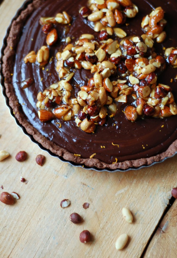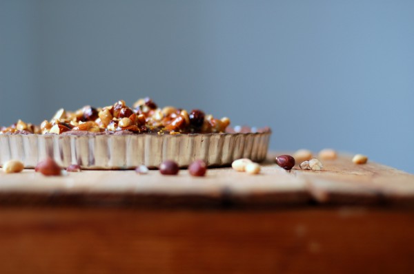 Hacka nötterna grovt. Blanda råströsockret till sockernötterna och sirapen i en kastrull och hetta upp tills sockret smält och blandat sig med sirapen. Sänk värmen, rör ner nötterna och fortsätt att röra under tiden som blandningen sjuder. Låt nötblandningen bli gyllenbrun (det tar ungefär 5-10 minuter) och häll den sedan över den kalla chokladpajen. Låt svalna (gärna i kylskåp) och servera med vispad grädde eller vaniljglass.