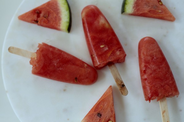 Jag är verkligen helt insnöad på vattenmelon just nu. Den är min absoluta favoritfrukt, och det faktum att det finns fina ekologiska meloner att få tag på just nu gör att jag äter den hela tiden. Som den är eller som svalkande melondricka. Eller varför inte som sådana här trevliga glasspinnar?! Bästa grejen en solig dag!