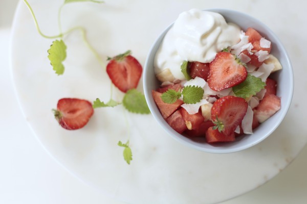 Jag älskar när mellanmål smakar efterrätt! Och det bästa med mitt jobb är (förutom att det alltid finns chokladkaka hemma) alla frukter och bär som blir över när man dekorerar bakverk. I dag slängde jag ihop en enkel och somrig fruktsallad av överbliven garnityr- Vattenmelon, banan, jordgubbar och stora kokosflingor. Toppat med lite vispad grädde och citronmeliss. Så himla gott!