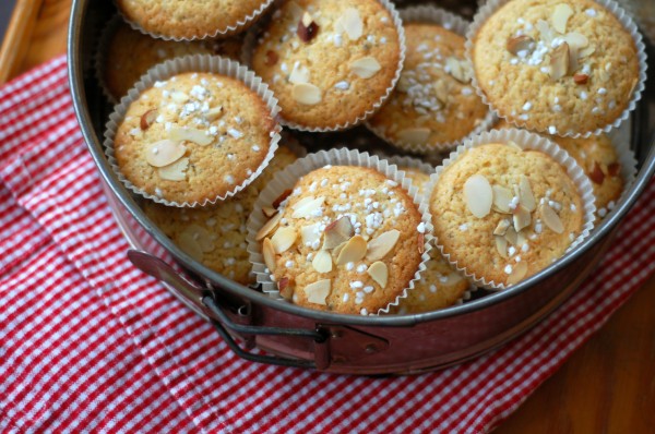 Blanda smör och socker och rör sedan i äggen, ett åt gången. Blanda ner övriga ingredienser och häll smeten i muffinsformar. Strö över lite flagad mandel och pärlsocker över varje muffin. Grädda i 175 grader i cirka 20 minuter.