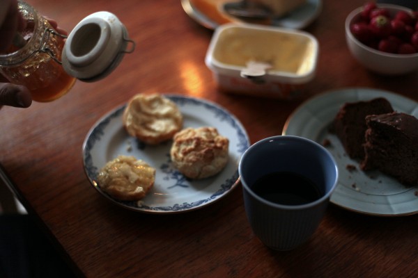 En av de i särklass bästa sakerna med semester är hur annorlunda frukosten blir. Istället för att skynda i sig en kopp kaffe framför datorn får det ta tid, gå långsamt och vara länge. Vi äter nygräddade scones eller amerikanska pannkakor i stort sett varje morgon under sommaren och låter ingenting skynda på. Hjälp, vad jag behöver det!
