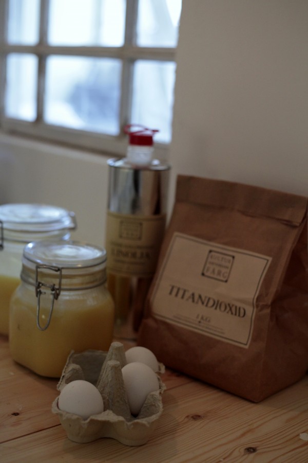 Först behöver man göra en emulsion som man kan blanda färgpigmenten med. Emulsionen förvaras i kylskåp i en stängd burk och håller i ungefär en vecka. Mitt grundrecept räcker till ungefär en halvliter emulsion, vilket således ger en halv liter färg. Färgen är otroligt dryg, en halvliter färg räcker till ett helt skåp, lite beroende på hur många strykningar man gör, men ska man måla ett helt kök behöver man såklart göra mer.